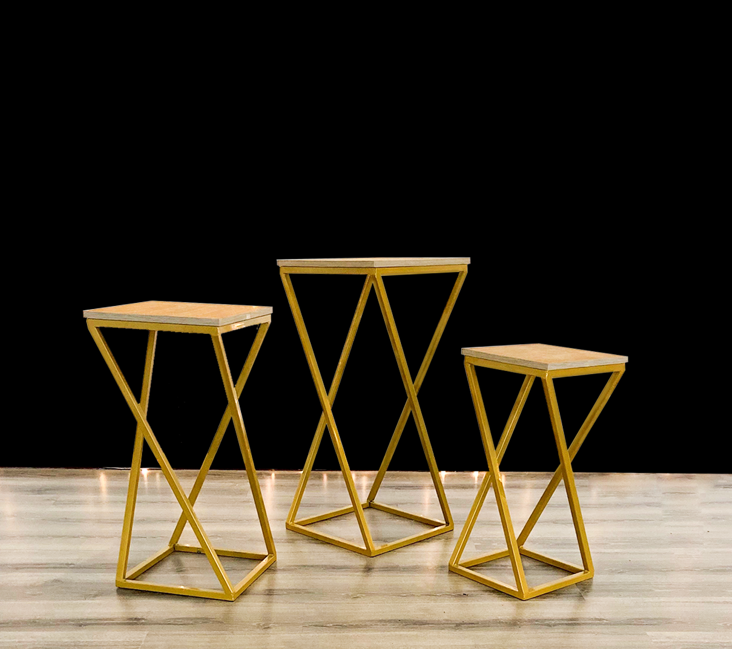 Adding a touch of elegance and functionality to your event is this set of 3 elegant square tables. These tables will elevate the ambiance of any gathering. Whether you are organizing a wedding, a corporate event, or an informal meeting, they offer both practicality and sophistication, ensuring that your event stands out